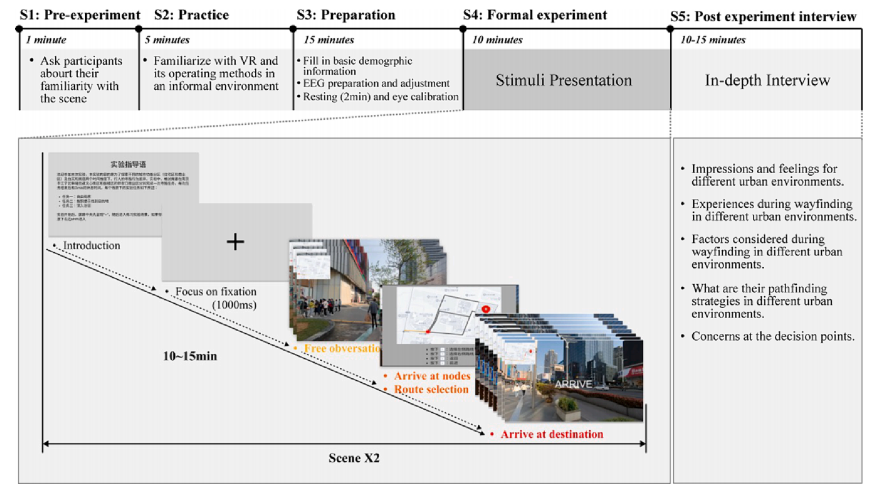 寻路,即利用环境线索找到并到达目的地的过程,对于个体与周围环境的互动至关重要。城市环境的布局和建筑属性各不相同,导致人们的体验、空间感知存在差异,这些差异会影响人们在寻路过程中的表现,从而影响寻路行为和认知状态。同时,光照条件的变化也会影响感知,影响认知地图和寻路行为。但是,不同城市环境类型和光照条件对行人寻路认知的影响研究有限。本研究提出了一种将VR(嵌入式全景照片)、眼动追踪和脑电图相结合的融合技术来采集同步数据,主要关注寻路过程中的感知行为、注意机制和神经振荡,旨在增强对寻路的认知过程的理解。