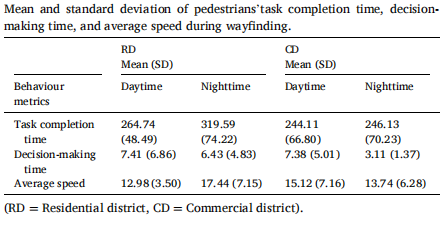 在任务执行方面,本研究发现不同城市环境下受试者的任务完成时间存在显著差异,住宅区的任务完成时间比商业区的要长。但是,这两个区域的平均速度没有显著差异。