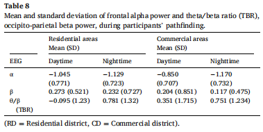 图6显示了所有条件下PD(瞳孔扩张)的持续下降,与商业区相比,住宅区的PD明显更高,表明商业区寻路的认知负荷更高。此外,住宅区和商业区白天的PD均小于夜间。对PD方差进行统计分析(见表7和图8),发现城区的主效应显著(p = 0.004),住宅区的PD方差大于商业区。此外,光环境的主效应显著(p = 0.001),在住宅区和商业区,夜间的PD方差均高于白天。